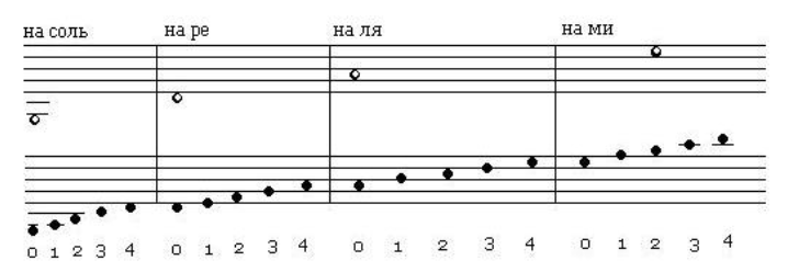Значительно сложнее обстоит дело у скрипача. Не имея никаких внешних ориентиров на грифе, он должен научиться на ощупь, по слуху, находить пальцем место для каждого звука, что требует значительно большего развития музыкально-слуховых навыков.Единственным слуховым ориентиром для него является звучание открытой струны, от которой он может находить последующие звуки.