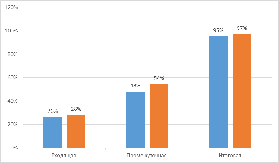 Итоги результатов промежуточной диагностики показали, что средний процент освоения учебного материала на промежуточные внедрения образовательной программы в процесс обучения составляет: на период 2023-2024 учебного года в среднем 48%; на период 2024-2025 учебного года в среднем на 54%.