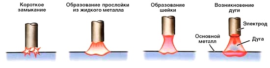 Возникновение сварочной дуги происходит в несколько этапов (плакат):