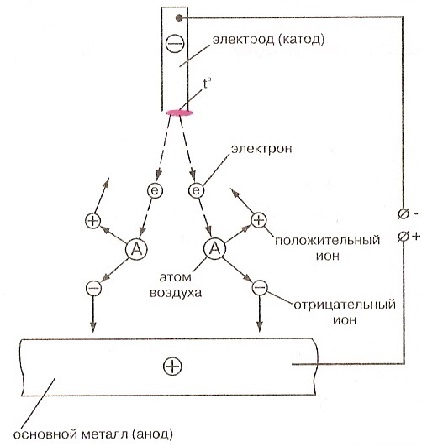 Расстояние между электродом и металлом заполнено нейтральными атомами воздуха. Для образования и поддержания горения дуги необходимо иметь в промежутке между электродами электрически активные отрицательно заряженные частицы – электроны, а также положительные – ионы. Процесс образования электронов и ионов называется ионизацией, а газ, содержащий электроны и ионы, ионизированным. Прохождение электрического тока через газы называется электрическим разрядом. Ионизация дугового промежутка происходит во время зажигания дуги.