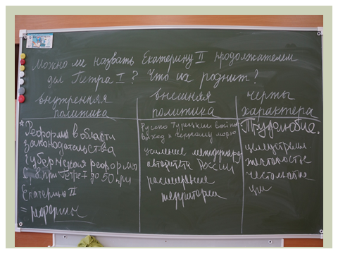 Сначала я использовала элементы проблемности в эвристических беседах и дискуссиях. Затем стала вводить проблемные вопросы и задания с выходом на проблемную ситуацию. Например, при оценке политики Ивана Грозного, Петра Великого, ЕкатериныII студентам предлагается написать сочинение-рассуждение о противоречивых результатах их деятельности. Следующий шаг-это проведение отдельных проблемных уроков. Все это вызывает у студентов живой и неподдельный интерес. Меняется и роль преподавателя на уроке. Теперь обучающиеся не ждут от меня информацию в готовом виде, а стремятся к самостоятельному поиску знаний, слушают чужую точку зрения и учатся аргументировать свою.