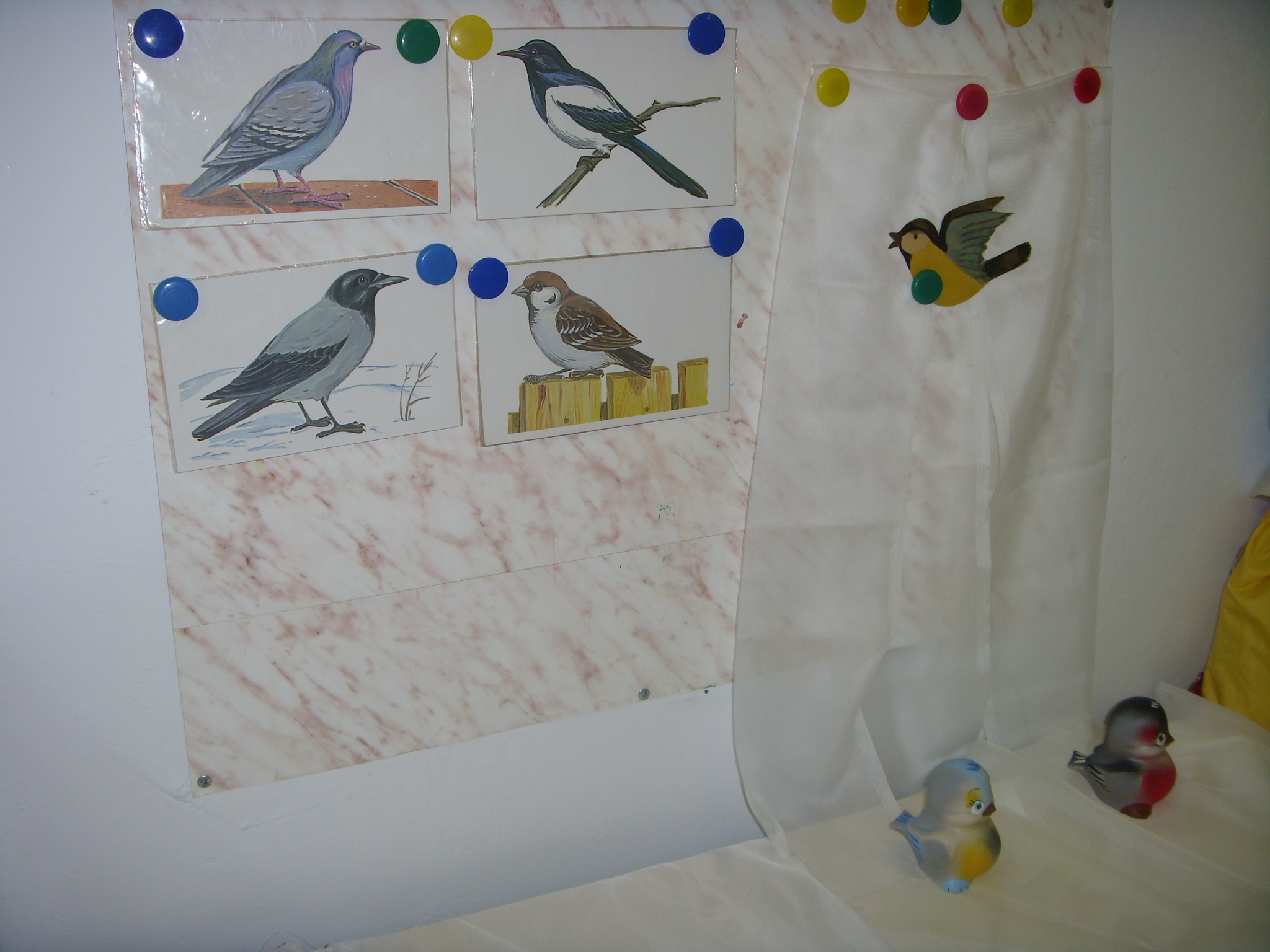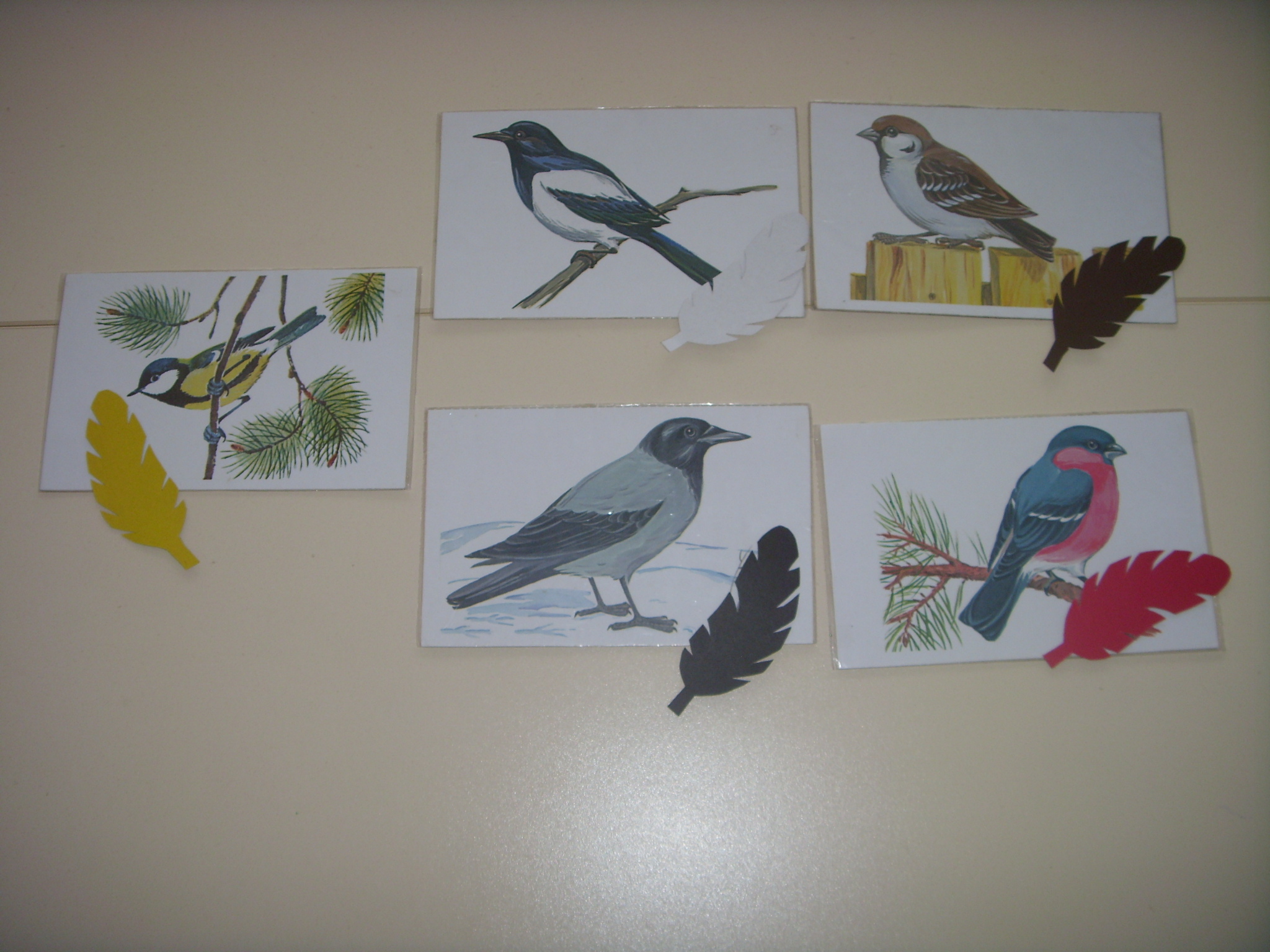 Материал: игрушечный дворик, куда прилетели птицы, картинки с изображением птиц: голубь, ворона, воробей, сорока, снегирь, синица, игрушки снегирь, синица, силуэты этих птиц, на подносе корм для птиц (съедобные и несъедобные), конверт с геометрическими фигурами для составления птиц, кормушка, фломастеры, карточки с изображением птиц с недостающей частью тела (для дидактической игры «Чего не хватает?»).