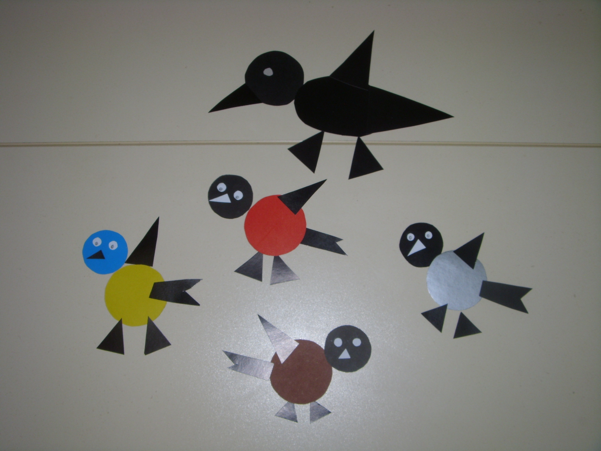 В. Молодцы ребята. А сейчас мы с вами поиграем в игру «Что за птица?» Посмотрим в конвертики и узнаем что за птица спряталась там. (дети на коврике составляют птиц из геометрических фигур) Дима, скажи, какая птица у тебя получилась?