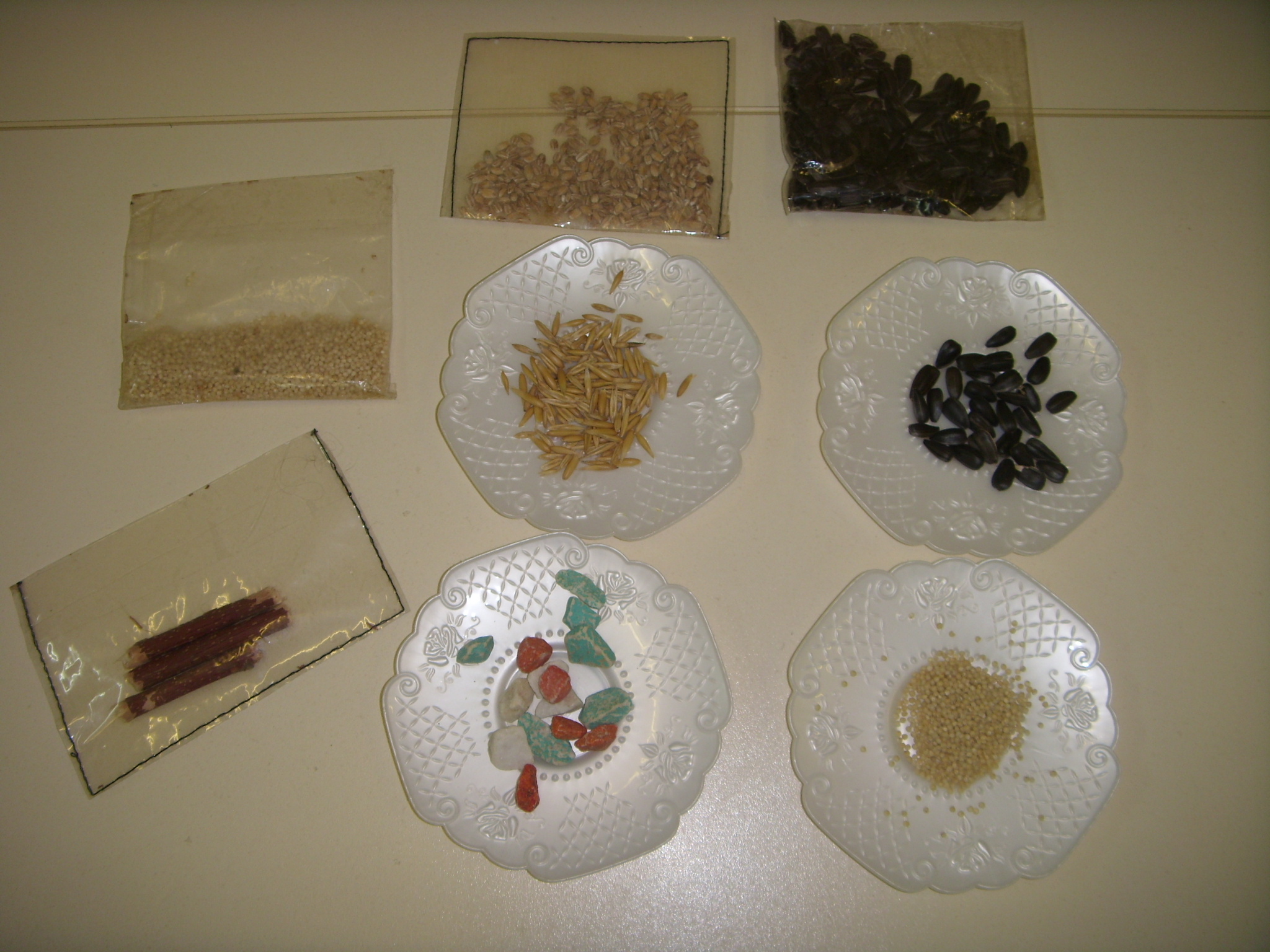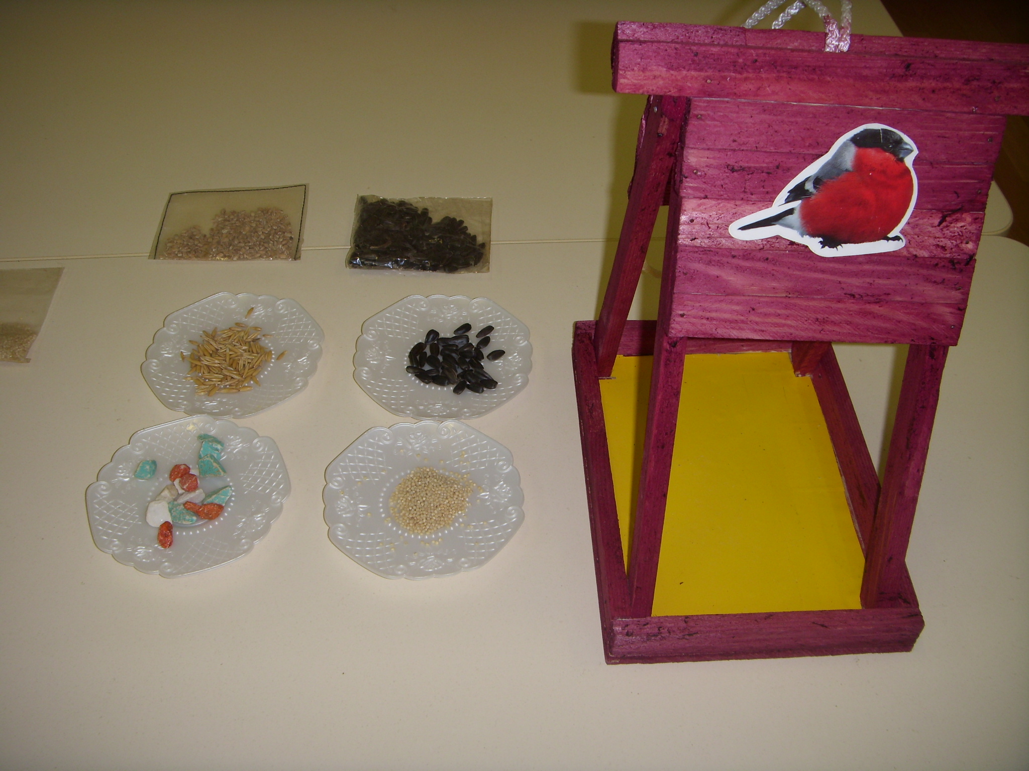 В. Какие вы молодцы. Посмотрите ребята, у меня на столе приготовлено много различного корма. Каждый по одному подойдёт и возьмёт тот корм, который нравится и рассыплет корм в кормушку для птиц.