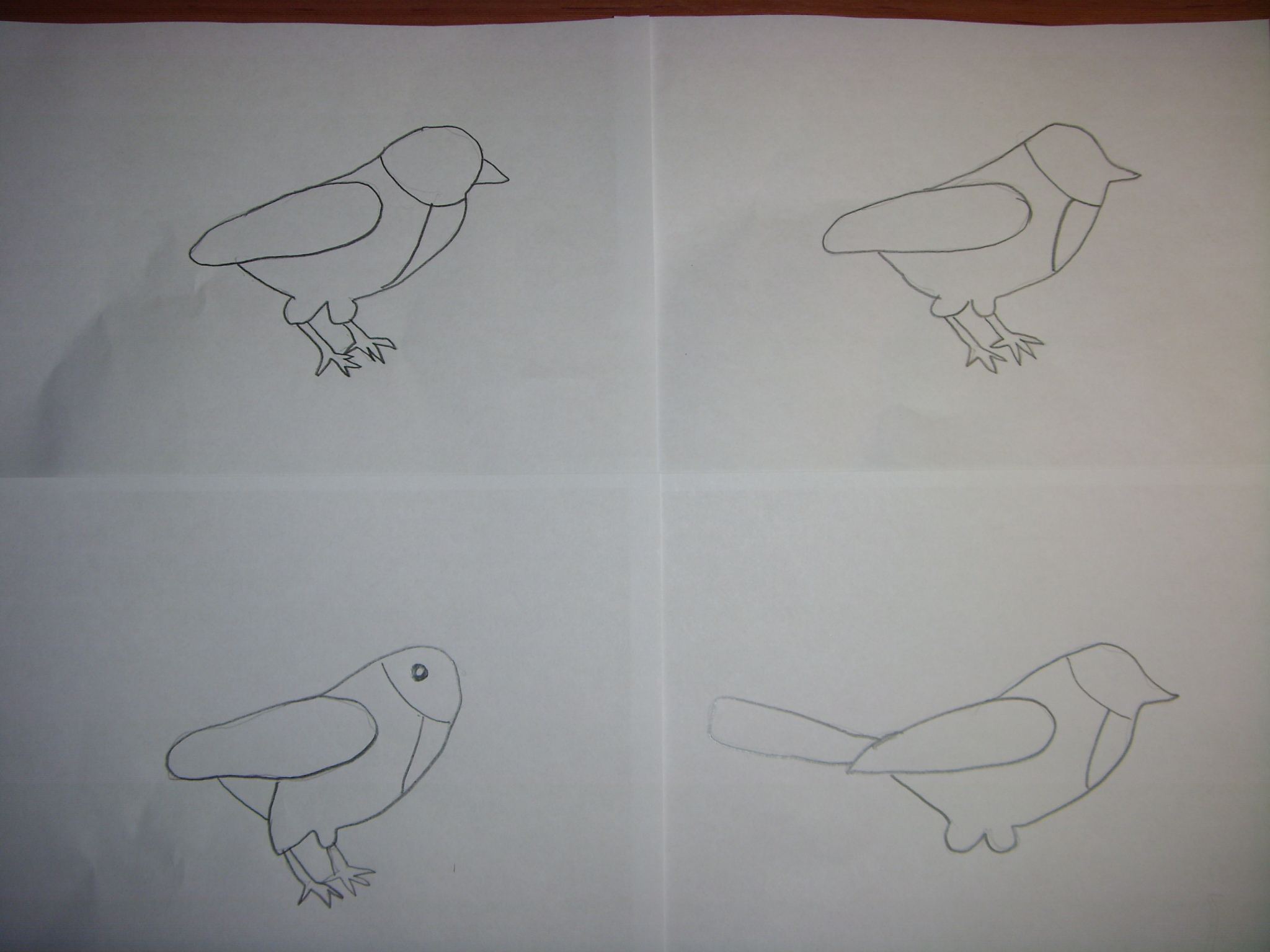 3. Встречаем синицу (грудка жёлтая, шапочка синяя, есть хвост короткий, крылья, на голове глаза, клюв)