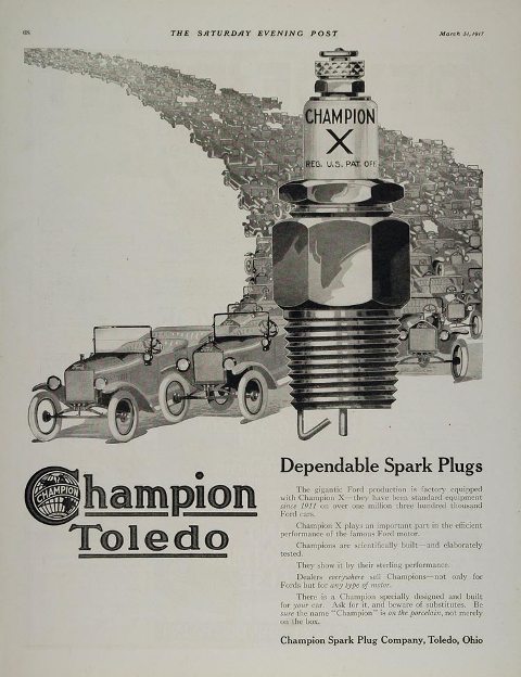 В 1898 году, сразу три патента на изобретение и разработку систем искрообразования были оформлены Николой Тесла, Робертом Бошем и Фредериком Ричардом Симсом. Этот год можно уверенно назвать основой для современных свечей зажигания. Но лишь благодаря стараниям Готлиба Хоннельда, сотрудничавшего с Робертом Бошем в 1902 году на свет появилась свеча, способная работать в системе Магнето. В начале 1900-х годов братья Роберт и Фрэнк Стрэннахан, занимавшиеся продажей автомобильных запчастей решили модернизировать свечу. Собрав необходимую информацию, свеча была отправлена на доработку. Изолятор изготовили из фарфора и было добавлено металлическое кольцо для уплотнения в месте посадки. В результате этих поисков и доработок, в 1908 году образовалась компания Champion, которую вы прекрасно знаете. Более 300 тысяч свечей нового поколения было приобретено компанией Ford и Triumph. Существует легенда о неком Эдмонде Бергере, который придумал особый вид свечи, но пропал без вести, а свой рисунок оставил неизвестному инженеру одной из компаний находившейся под крылом Champion.