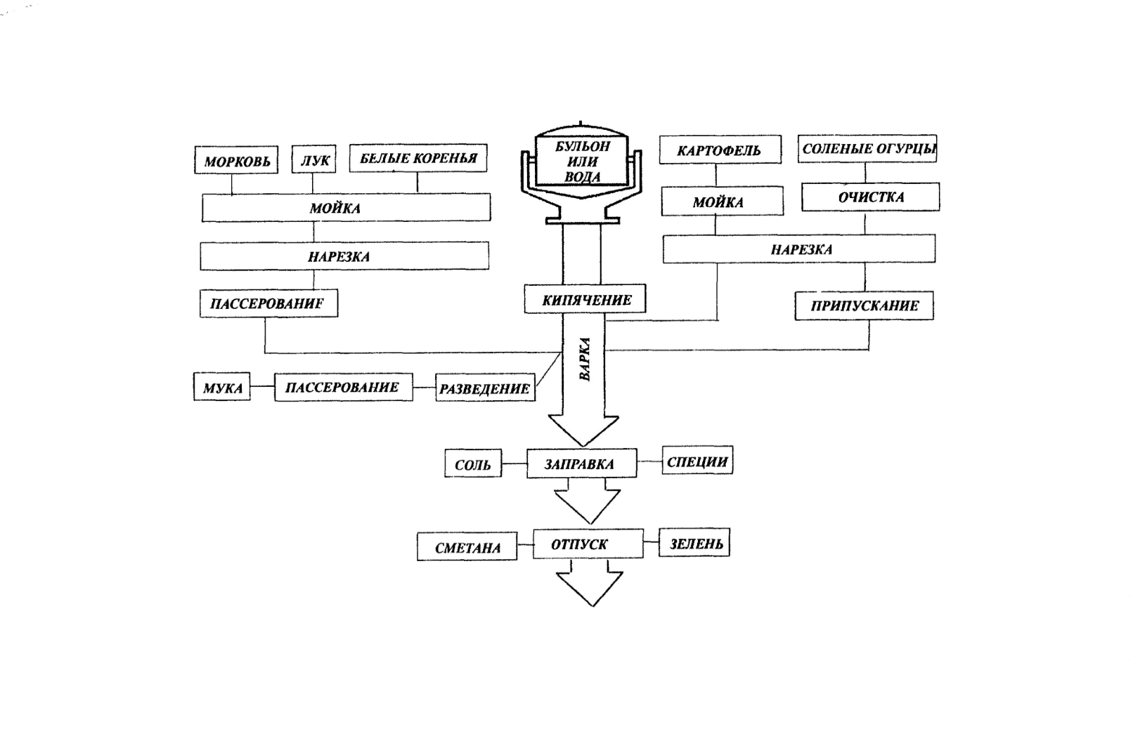 В кипящий бульон кладут белокочанную капусту, нарезанную соломкой, доводят до кипения, закладывают картофель, варят до полуготовности, кладут пассированные овощи, через некоторое время добавляют припущенные огурцы, специи, вводят огуречный рассол, соль и варят до готовности.