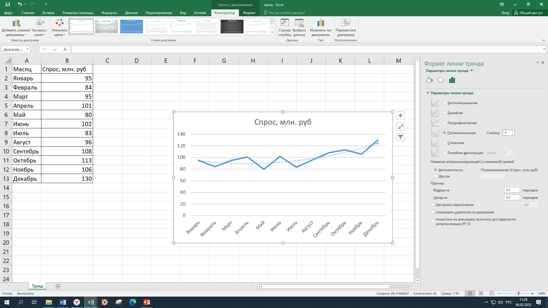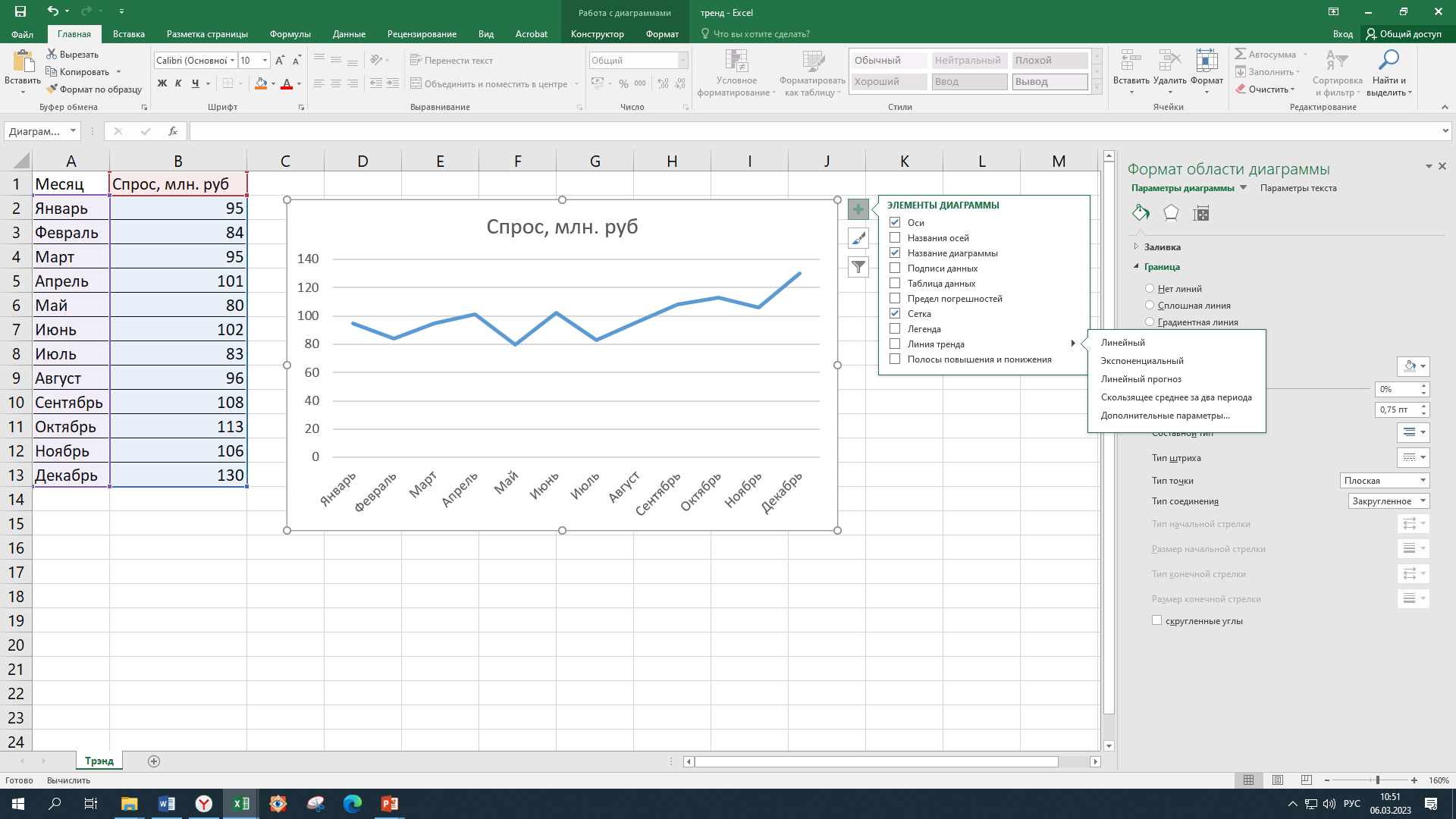 Добавление линии тренда: