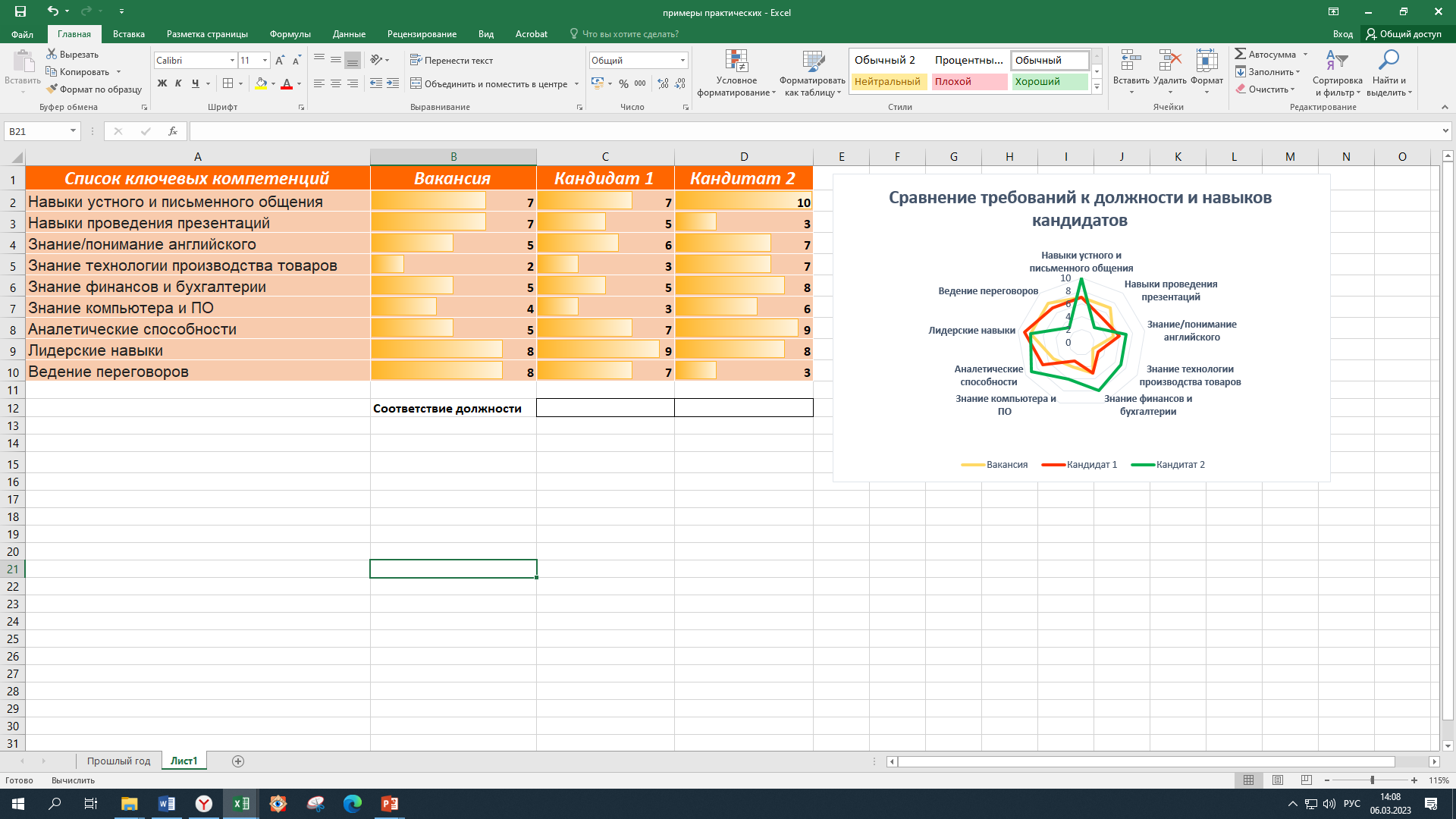 Для вычисления итогового численного значения «попадания в должность» можно использовать следующую формулу (для ячейки C12):