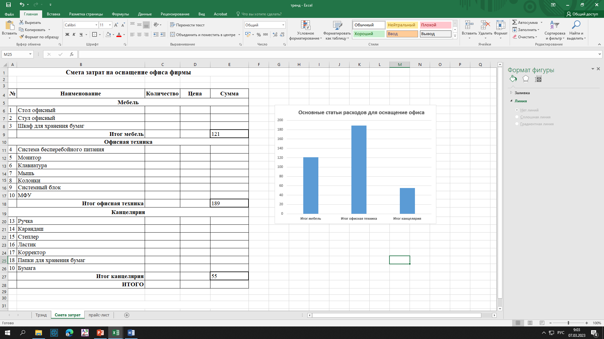 Составить смету затрат на оснащение офиса фирмы (количество и цена – исходные данные, СУММА и ИТОГО – расчетные).