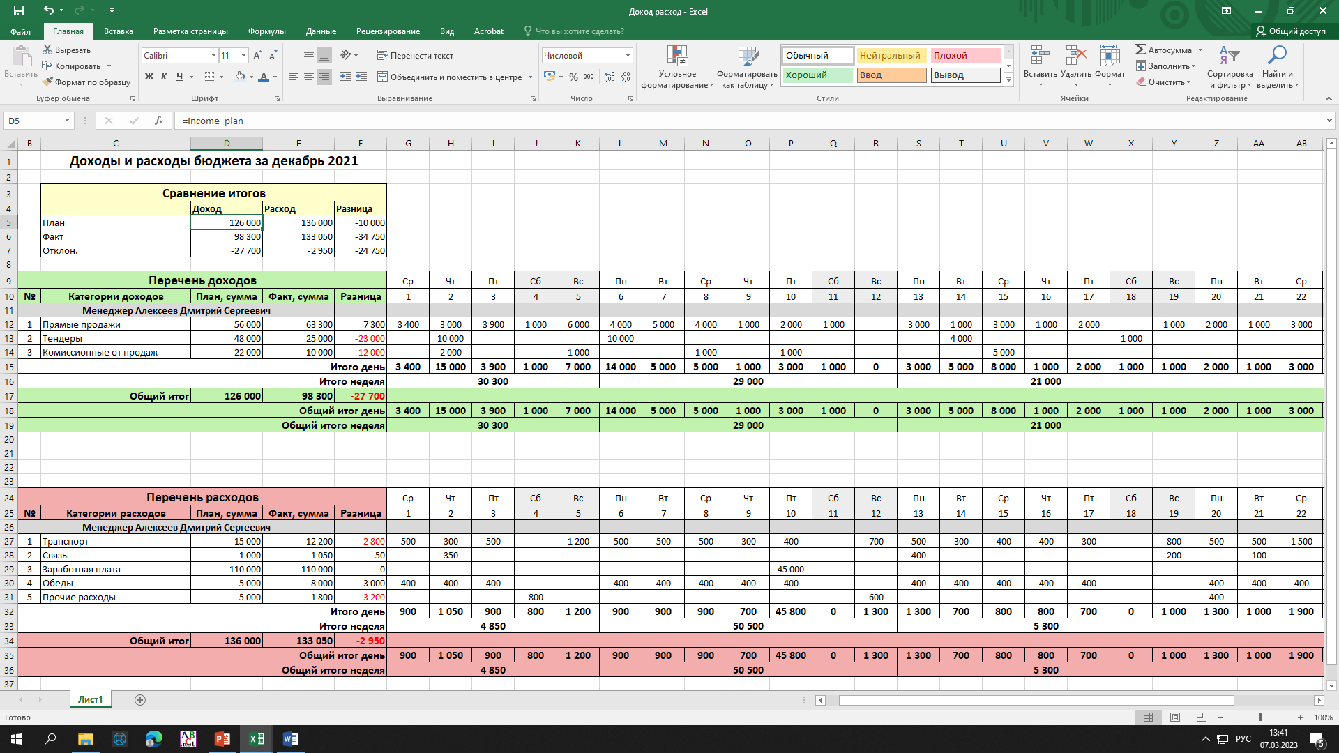 Задание 2: Оформить Ведомость доходов и расходов бюджета фирмы