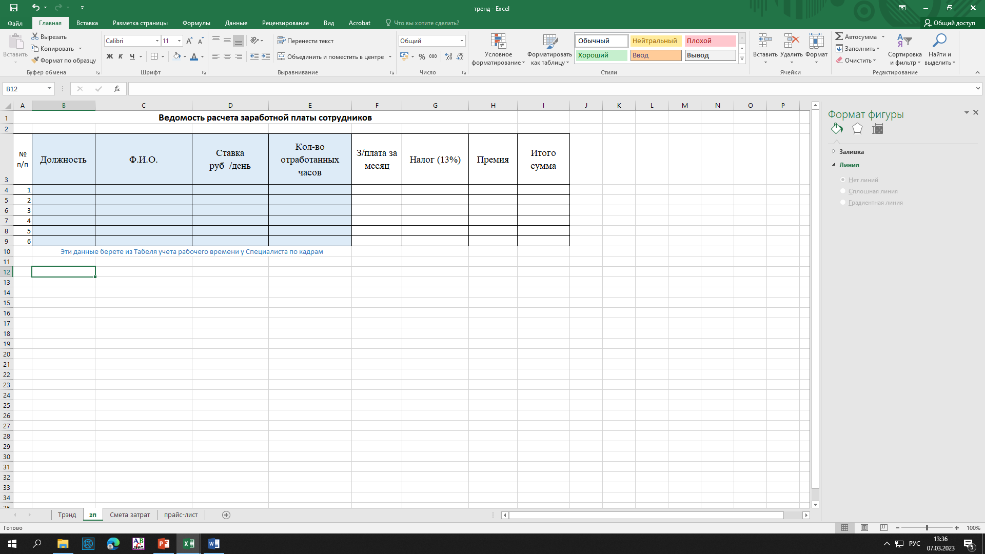 Задание 2: Оформить ведомость расчета заработной платы сотрудников с учетом рабочего времени (количество отработанных часов, уточняете у СПЕЦИАЛИСТА ПО КАДРАМ).