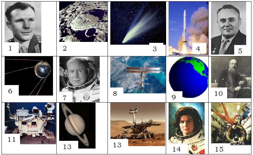 Ответы. 1) Гагарин, 2) Луна, 3) комета, 4) ракета, 5) Королев, 6) спутник, 7) Леонов, 8) МКС, 9) Земля, 10) Циолковский, 11) луноход, 12) Сатурн, 13) марсоход, 14) Терешкова, 15) невесомость.