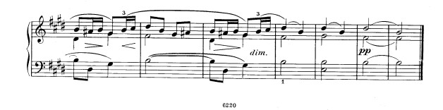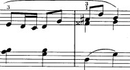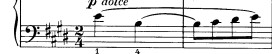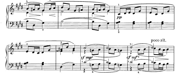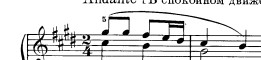 Первые три такта – первая мысль. Которая начинается не с тоники – ми мажора, а с IVcтупени лада – до #минора. Мелодия, начинаясь с квинты до# минора и с ощущения наполненности эмоциональной, далее спускается через си мажор и к концу второго такта уже слышим тонику, спуск завершился. Третий такт несет характер повторяемости и успокоения.