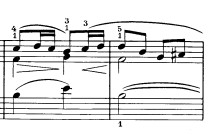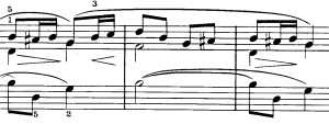 Еще одна трудность – это аппликатура. Предлагаю вот такую. В ней после «ФА» на вторую долю поднимая кисть даем возможность мягко поставить 5 палец и начать мини мотив к началу второго такта.