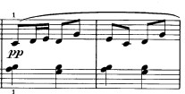 Вторая задача заключается в интонировании темы в октаву. Она построена с напряжением к сильной доле оба раза. Нужно интонационно показать динамику, понять и услышать секвенцию и возрастание напряжения. Для обеспечения глубокой певучести усиливаем напряжение и чувство опоры на клавиши, и, объединяющим движением по направлению к кульминациям мотивов, ведем вес, вниз отпускаем вес и облегчаем пальцы.