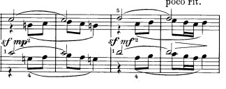 Здесь три задачи. Первая возгласы октавные наsforzando. Первый раз появились акценты, решительность, уверенность. Но певучесть звуковая не ушла. Берем звуки пальцами и кистью, чтобы была амортизация и цепляем кончиком пальца, это даст возможность получать поющий долгий звук. Основная задача провести мысль через все события двух тактов и довести до следующей половинной ноты, увеличивая напряжение.