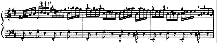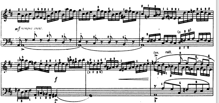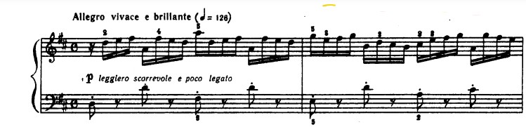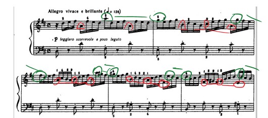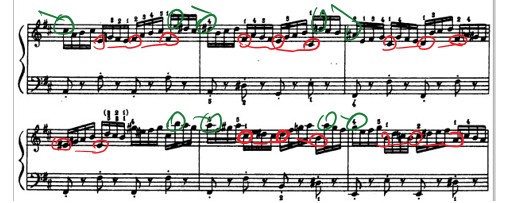 Понимаем, что интонационный далекий мотив на 5 ступень (и т.д.) мы не можем интонировать, как если бы это была романитическая пьеса, добавляя rubato. Этот интервал мы не будем интонационно доставать, так как важно сохранить точность, моторность. Поэтому эти нотки будут засвечены, как бы серебрянным блеском. Успеть быстро проинтонировать большой интервал, будет вызывать необходимость быть более заряженным энергией.