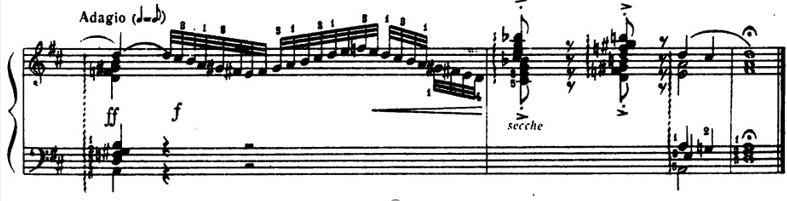 В первом такте данного отрывка так же, как мы уже рассмотрели, а во втором такте меняется драматургия. Здесь происходит спуск ступенями, секвенционно, задерживая напряжение. В четвертом такте рост драматургии тоже за счет септим.