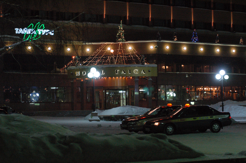 1Ведущий: В декабре 1970 года гостеприимно распахнула свои двери гостиница «Тайга».Гостиница расположена в центре города, в 40 км от аэропорта и 15 км от железнодорожного вокзала. Располагает 150 номерами, 7 этажей. В гостинице имеется престижный ресторан «Тайга» с Европейской и Русской кухней на 176 мест, кафе, бар, сауна, Сервис – бюро. Приглашаем гостей на дегустацию фирменного сибирского блюда.