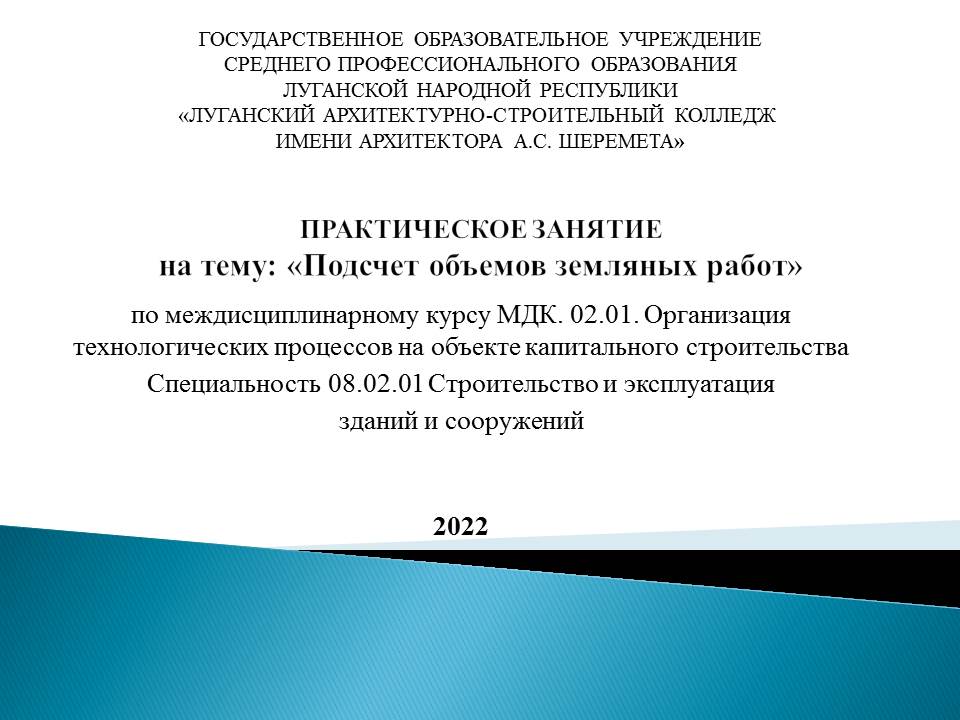 Представленная методическая разработка открытого практического занятия «Подсчет объемов земляных работ», входящего в междисциплинарный курс МДК.02.01 Организация технологических процессов на объекте капитального строительства ПМ.02 Выполнение технологических процессов на объекте капитального строительства, составлена на основе и в соответствии с федеральным государственным образовательным стандартом по специальности 08.02.01 Строительство и эксплуатация зданий и сооружений.