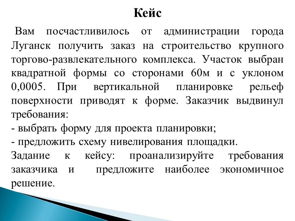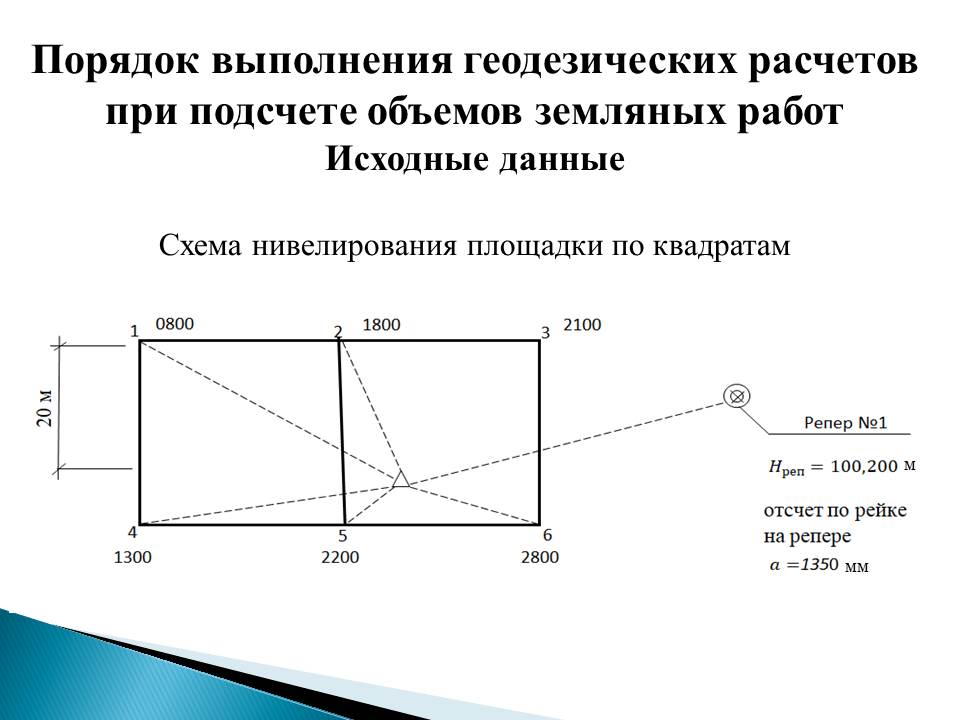 Задача:приобретение опыта в подсчете объемов земляных работ при вертикальной планировки площадкина основе изученного теоретического материала.