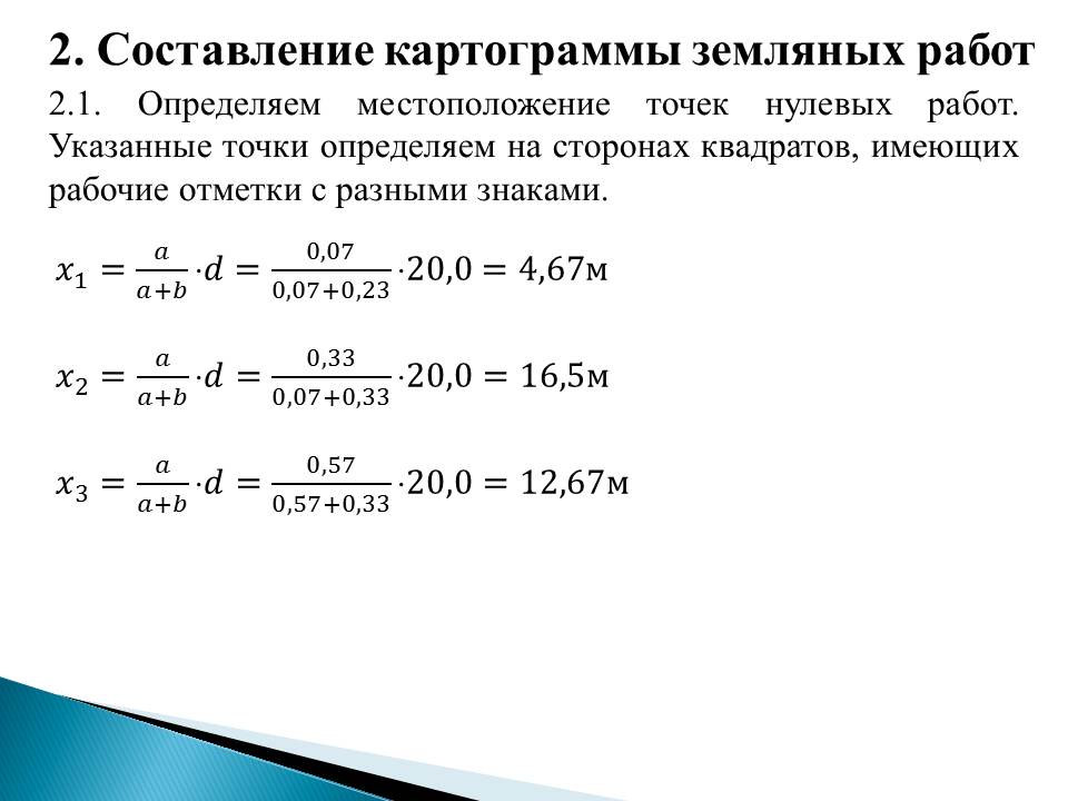 5.3.2.Определяем местоположение точек нулевых работ. Указанные точки определяются на сторонах квадратов, имеющих рабочие отметки с разными знаками.
