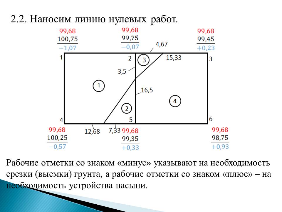 Рабочие отметки со знаком «минус» указывают на необходимость срезки (выемки) грунта, а рабочие отметки со знаком «плюс» - на необходимость устройства насыпи.