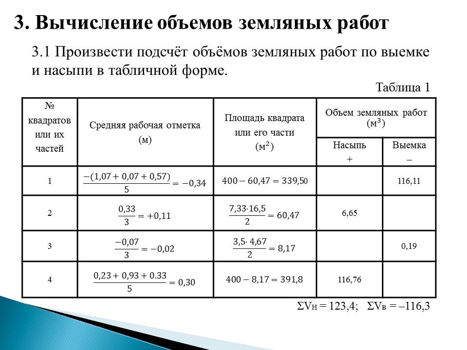 Производим подсчёт объёмов земляных работ по выемке и насыпи в табличной форме.