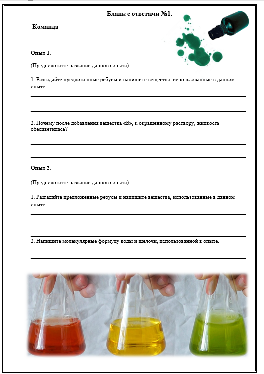 Преподаватель демонстрирует опыты, а студенты должны выполнить задания на бланке №1 к этим опытам. Задание 1 – придумать название к опыту, задание 2- по комплекту ребусов определить какие реактивы использовались в опыте (Приложение 1), 3 задание – ответить на вопрос в бланке №1 (Приложение 2) (на выполнение заданий к каждому опыту по 7 мин).
