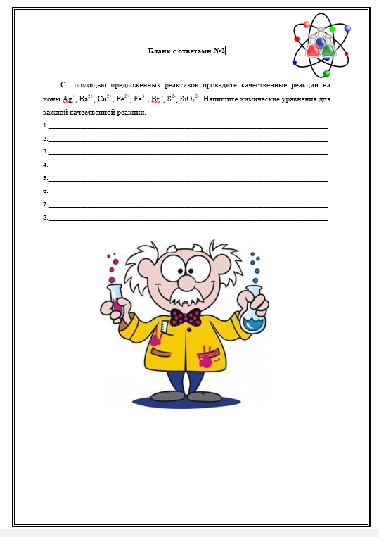 А сейчас переходим ко 2 этапу викторины. У каждой команды на столе стоят наборы химических реактивов. Наборы полностью идентичны друг другу. Ваша задача, с помощью предложенных реактивов провести качественные реакции на ионы Ag+,Ba2+,Cu2+,Fe2+,Fe3+ , Br-,S2-,SiO2-3 и написать уравнения реакций для каждой качественной реакции в бланке №2 (Приложение 3) На выполнение работы 20 мин.