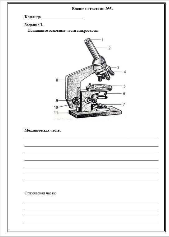 Вся предстоящая работа будет поделена на две основные части: биологическую и химическую. На каждом бланке нужно подписать название команды (заранее выбирается командир команды). Для выполнения заданий вам будут выданы бланки ответов №1, №2, №3. После выполнения заданий, бланки с ответами сдаются на проверку. На выполнение заданий вам отводится строго определенное время.