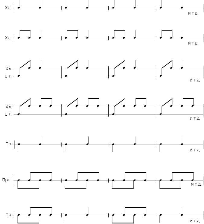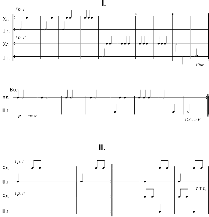Знакомство с этим направлением мы начнём с музыкально-ритмических игр (с хлопками), которые считаются устным народным творчеством, у которых комбинируются разнообразные виды хлопков, иногда встречается синкопа. Задача таких игр одна – повторить без ошибок последовательность движений синхронно с напарником в быстром темпе.