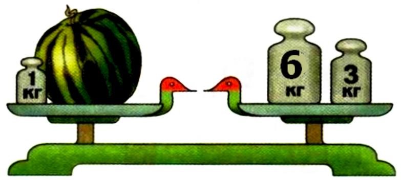 Рассмотрите картинку. Какова масса тыквы, если она весит столько же, сколько 3 арбуза?