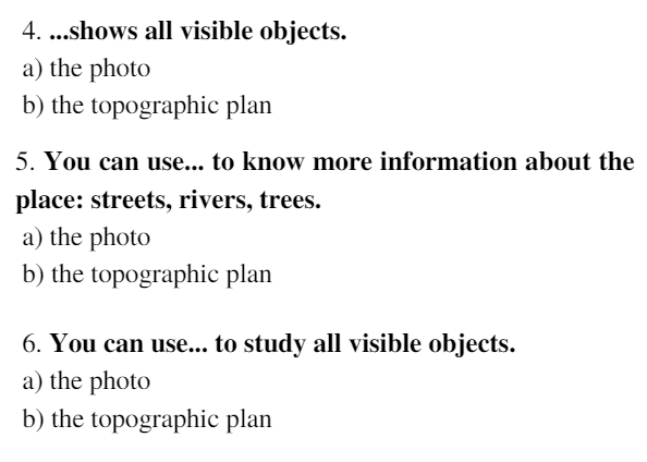 Знакомство с понятием «план местности» происходит с помощью задания «multiplechoice» на основе наглядности. Учащиеся, опираясь на картинку, изображающую снимок местности с воздуха и топографический пландолжны самостоятельно ответить на вопросы и прийти к выводу о том, чем отличается топографический план от фотографического изображения. С помощью этого задания происходит первичное знакомство с новым понятием, причем учащиеся самостоятельно анализируют изображения, учатся находить различия и самостоятельно делать выводы. Таким образом, на первый план выходит приобретение нового предметного знания, но происходит это на изучаемом английском языку. Кроме того, сразу в силу вступает мыслительный (cognition) компонент метода CLIL.