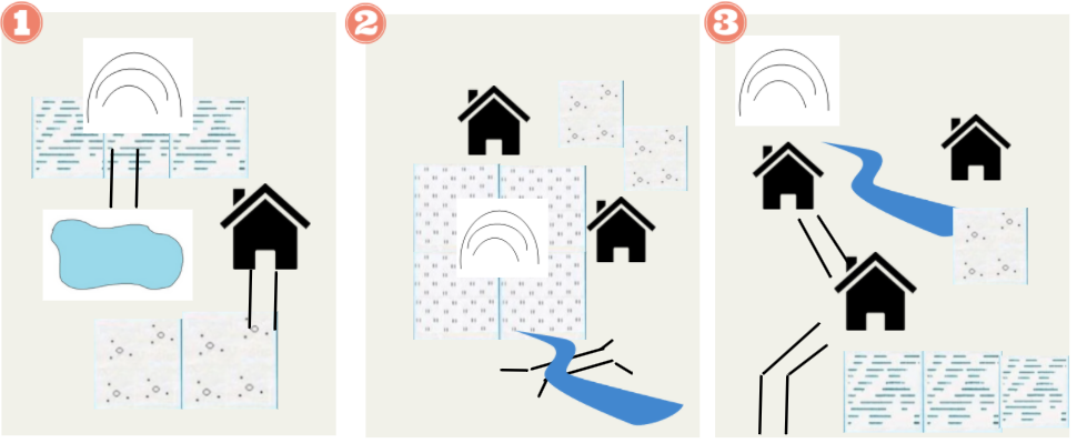 Пример: I have got a big house on the field. Go through the field. There are bushes on the left and a lake on the right. There is a big hill behind the house.