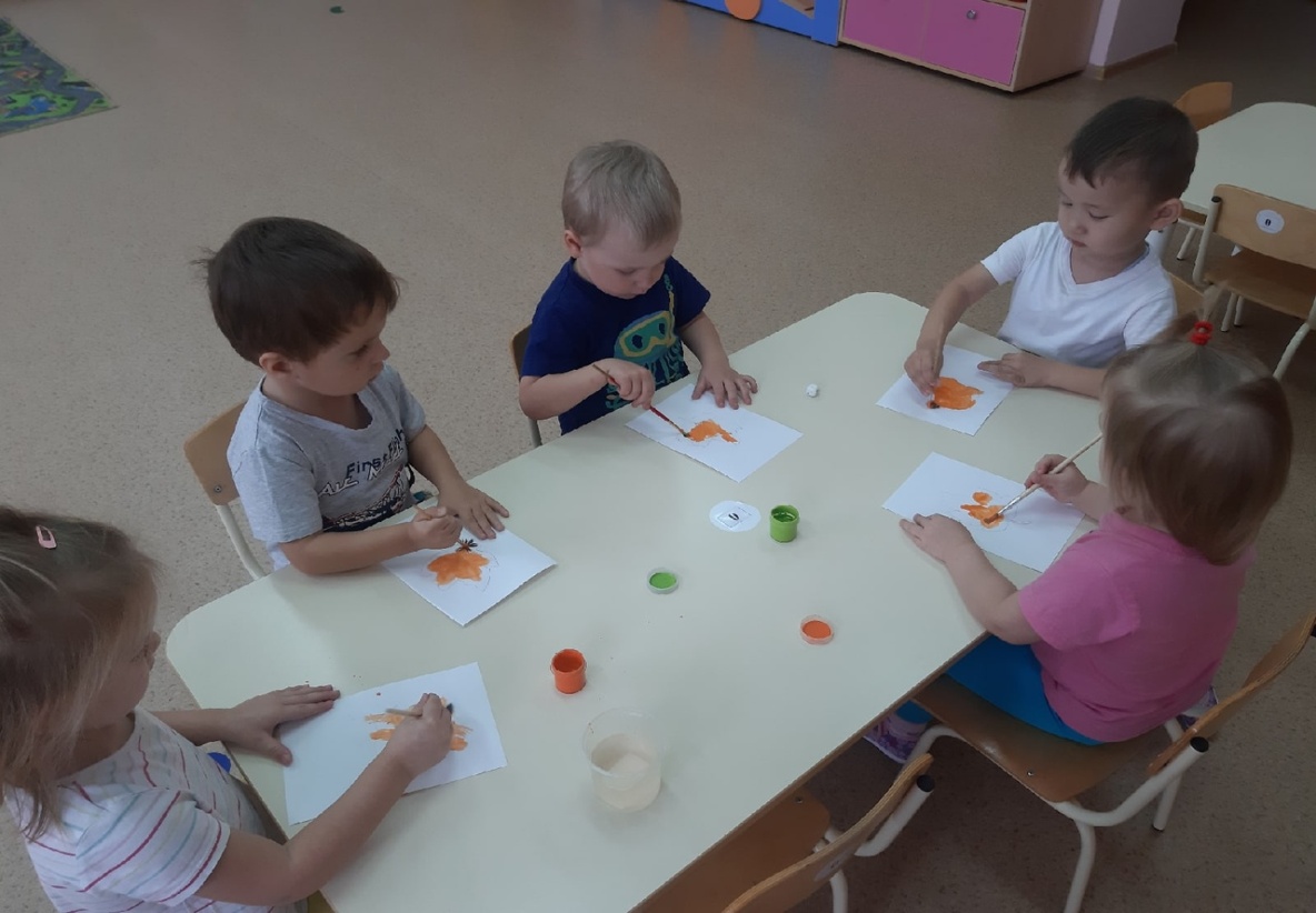 Рисование «Осенние листочки». Цель: - Формировать умение детей изображать листья пальчиками. - Знакомить с желтым и красным цветом. - Развивать чувство цвета и ритма. - Воспитывать интерес к познанию природы и отражению своих впечатлений в изобразительной деятельности. - Развивать мелкую моторику.