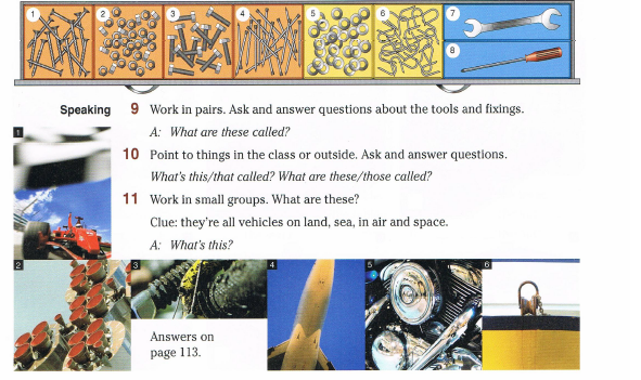 4. Grammar: What’s this(that) called in English? Обучающиеся рассматривают иллюстрации, сами формулируют правило употребления в речи указательных местоимений. Умение работать с информацией на иностранном языке. Умение искать причинно-следственные связи 5.Vocabulary: работаем с помощью иллюстраций и флэш-карточек с лексикой, обозначающей крепежные материалы и инструменты (bolts,screws,nails,nuts,washersetc.)Умение работать с информацией на иностранном языке. Умение работать с профессиональной литературой 6.Groupwork: ребята делятся на 2-3 группы, группа получает фрагмент картинки и ключ: все это транспортные средства. Угадывают, что изображено, называют по-английски. Умение договариваться, конструктивно решать задачи. Умение искать причинно-следственные связи