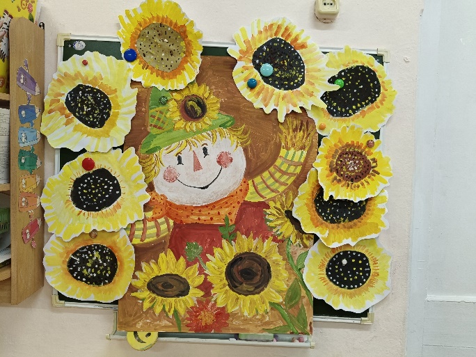 Украшение музыкального зала: панно из детских работ «Подсолнушки» и «Пугало»