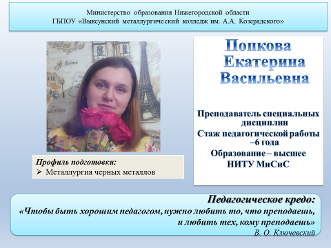 02.11.2020 Портфолио преподавателя профессионального цикла Принять участие в этом конкурсе Описание конкурса Список всех конкурсов Попкова Екатерина Васильевна ГБПОУ "Выксунский металлургический колледж имени А.А. Козерадского" Конкурсная работа Свидетельство участника экспертного совета жюри Свидетельство можно заказать сразу, как Вы оставите не менее 3 объективных комментариев в этом разделе сайта. Узнать подробнее Самообразование - ступень профессионального роста Я, учитель начальных классов. У вас недостаточно прав для добавления комментариев.Чтобы оставлять комментарии, вам необходимо авторизоваться на сайте. Если у вас еще нет учетной записи на нашем сайте, предлагаем зарегистрироваться. Это займет не более 5 минут.