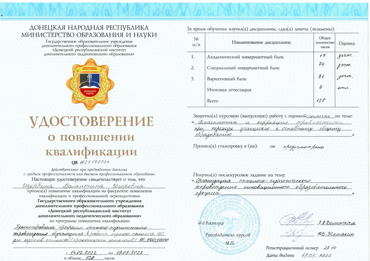 12. Дата прохождения курсов повышения квалификации | Курсы повышения квалификации педагогов-психологов при ГОУ ДПО «ДонРИДПО» с 14.02.2022 по 19.05.2022, удостоверение № 2514 |