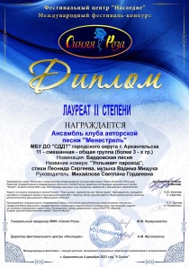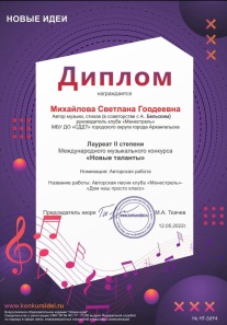 2022 г, диплом лауреата II степени Международного музыкального конкурса «Новые таланты» Номинация «Авторская песня» за сочиненную в клубе песню «Дом наш просто класс»