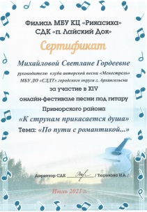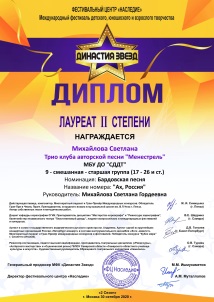2020г -международный фестиваль детского, юношеского и взрослого творчества «Династия звезд» 2 сезон диплом лауреата 2 степени трио клуба «Менестрель» – Боровик Юлия, Михайлова Светлана Г, Попов Роман А. за исполненную песню «Ах, Россия» -автор Виктория Черенцова.