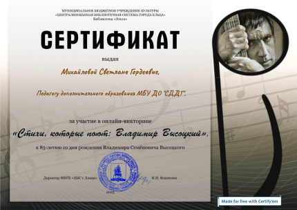 Мне вручены: сертификат за участие в онлайн-викторине «Стихи, которые поют: Владимир Высоцкий» к 85- летию со дня рождения автора- 2023 г 25-26 января