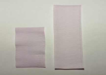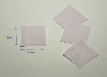 Вырезать 2 полоски вдоль гофрирования шириной 5см, длина 30см ,растягиваем, нарезаем 10 штуки квадратиков для бутона 5см.на 5см..