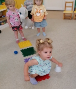 Материалы: 4 массажных коврика, пластиковый стаканчик, массажный мячик.