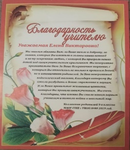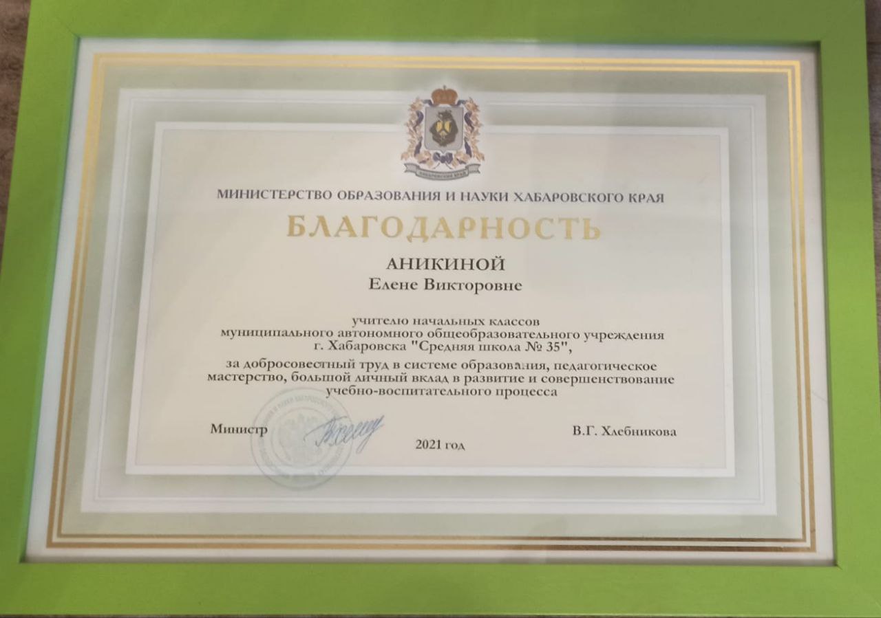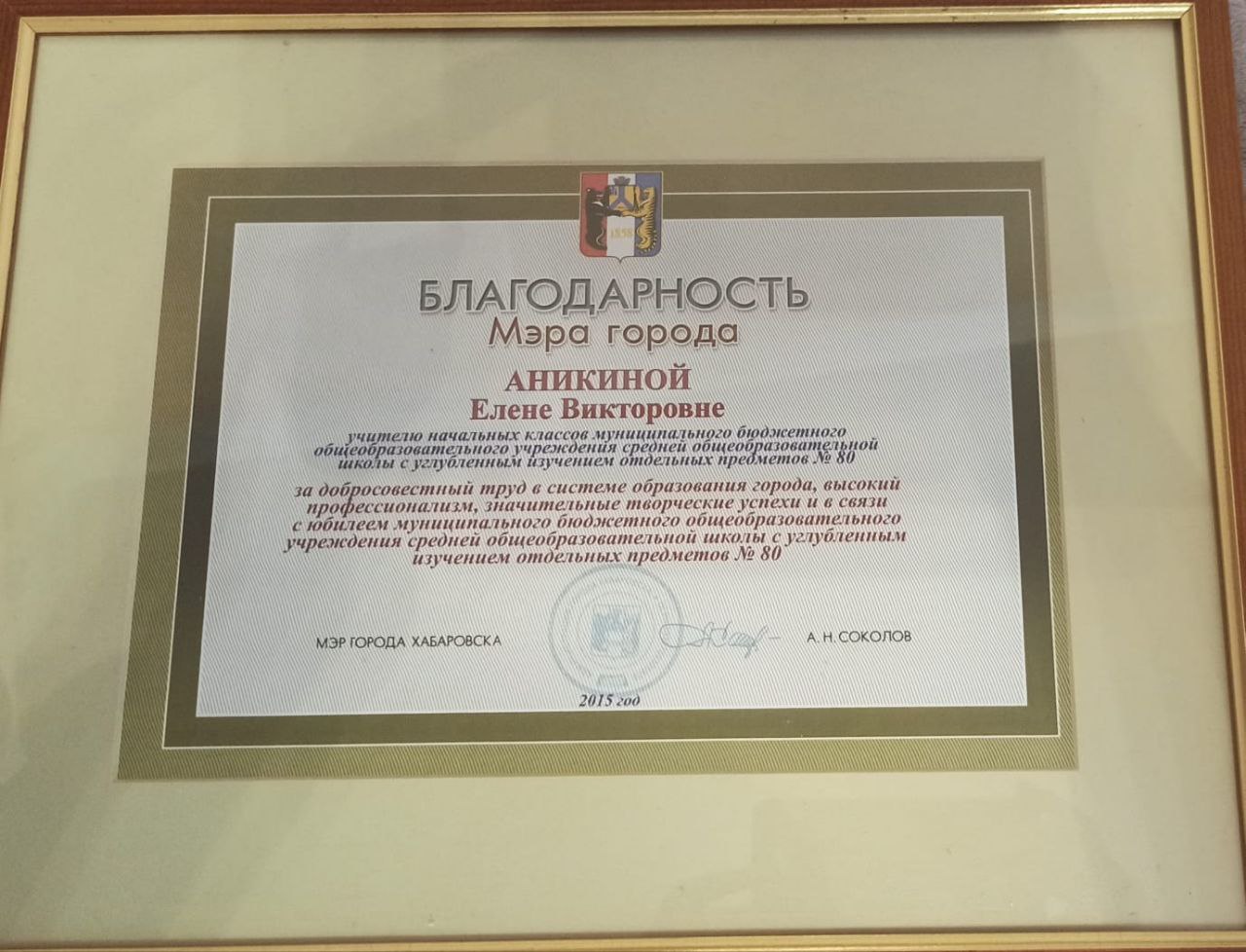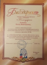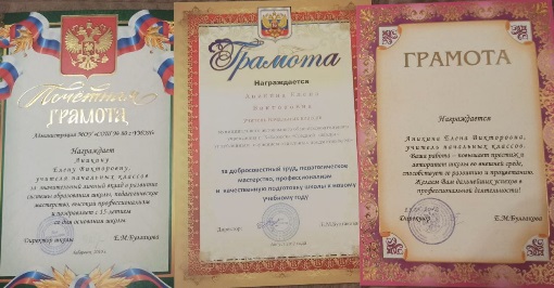 Также Елена Викторовна регулярно получает благодарности за добросовестный труд и профессиональное мастерство от администрации школы.