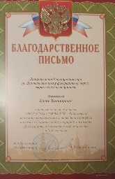 Имеет благодарственное письмо от Департамента Росприроднадзора по Дальневосточному федеральному округу за помощь в организации и проведении конкурса «Сохраним родную природу» в рамках Дней защиты от экологической опасности в Год экологии.