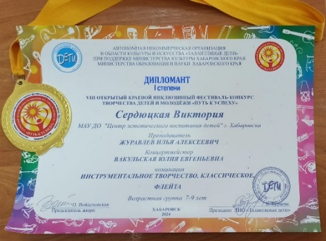 Является победителем отраслевого смотра – конкурса на лучшую организацию летней оздоровительной компании в образовательных организациях г. Хабаровска в 2024 году в номинации «Лучший воспитатель лагеря».