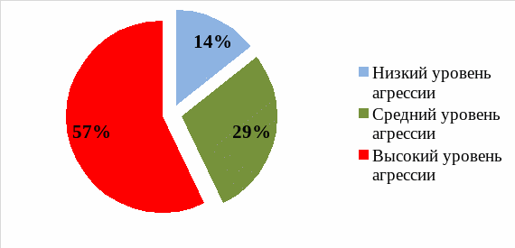 При анализе представленных диаграмм видно, что общий уровень агрессии имеет высокие показатели у 57% подростков.